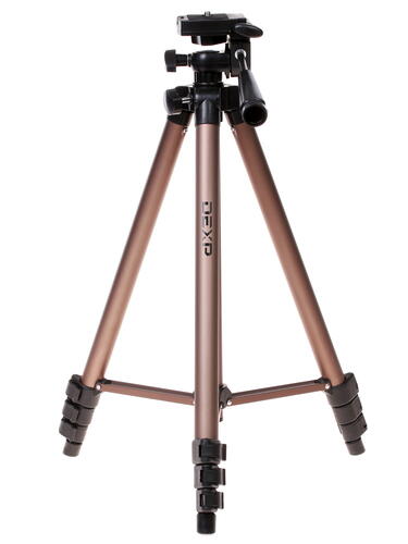 Штатив DEXP WT-3130N - телескопический трипод, который предназначен для установки на ровном полу. Он снабжен тремя раздвижными штангами с резиновыми площадками на конце для предотвращения скольжения. Обладая в сложенном состоянии очень малыми габаритами и помещаясь в небольшом чехле, штатив из металла коричневого цвета в положении с полностью расправленными штангами может иметь высоту 125 см. Минимальная рабочая высота устройства при этом равняется всего 40 см.