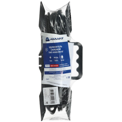 Удлинитель силовой Атлант 80062 - компактный удлинитель длиной 10 м на прочной рамке с розеткой для подключения бытового и строительного оборудования мощностью до 3,5 кВт. Кабель КГ 3×1,5 мм² гибкий и устойчив к изгибам. Розетка с крышкой и степень защиты IP44 обеспечивают безопасное использование как в помещении, так и на улице.