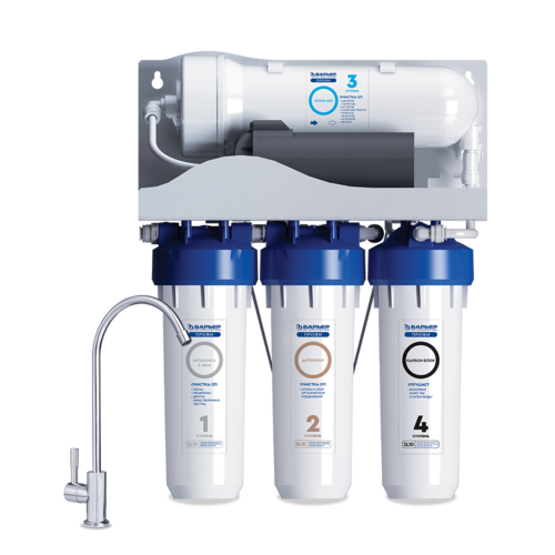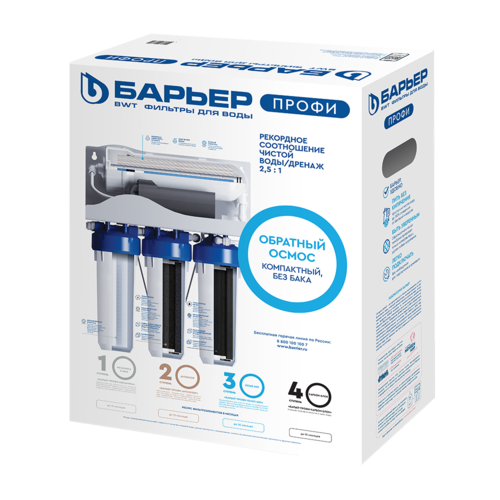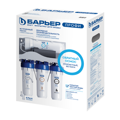 Первый компактный бытовой осмос БАРЬЕР с рекордной производительностью - 1,6 л/мин. 600 галонная обратноосмотическая мембрана пропускает только молекулы воды, задерживая все остальные загрязнения. 100% защита от накипи, бактерий и вирусов, а также нитратов, нитритов, фторидов, тяжелых металлов.