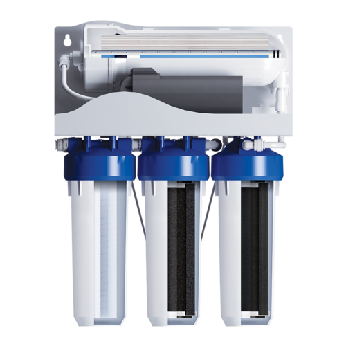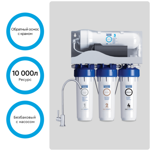 Система состоит из четырех ступеней очистки: 1. Механика 5 мкм - очищает воду от песка, ржавчины и других нерастворимых частиц. 2. Антихлор - доочистка воды от хлора, хлорорганики и фенольных соединений. 3. Обратноосмотическая мембрана защищает от бактерий и вирусов, солей жесткости, нитратов, нитритов, фторидов, тяжелых металлов. 4. Карбон-блок - улучшает вкусовые качества и запах воды.