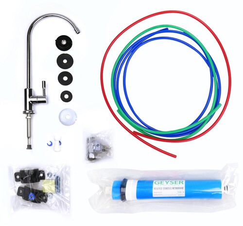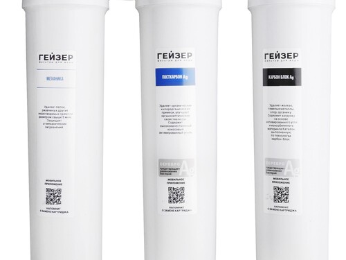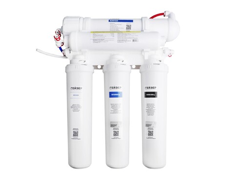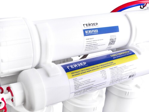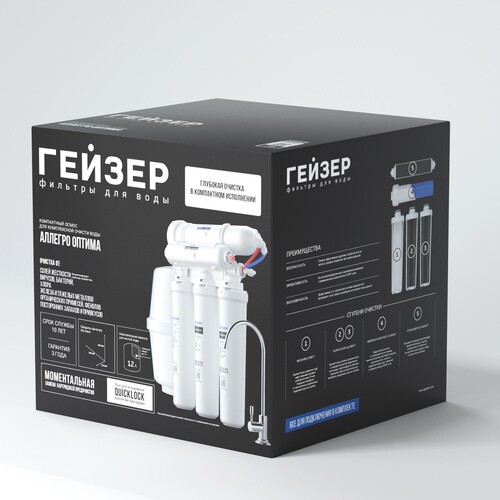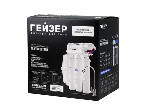 Система обратного осмоса «Гейзер Аллегро Оптима» предназначена для комплексной очистки воды. Жидкость проходит через 5 ступеней фильтрации для удаления солей жесткости, вирусов, бактерий, хлора, железа и других тяжелых металлов, органических примесей, фенолов, посторонних запахов и привкусов. Постфильтр, механический и угольный картриджи следует заменять каждые полгода, а мембрану обратного осмоса – через 1.5-2 года. При повышенном уровне железа, марганца, органических соединений и других примесей рекомендована более частая замена первых ступеней очистки.