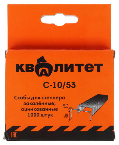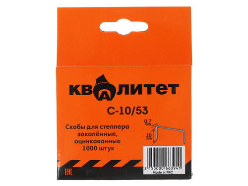 Скобы Квалитет С-10/53 имеют высоту, равную 10 мм. Толщина скоб равна 0.7 мм. Оснащение поставляется в количестве 1000 штук. Скобы упакованы в компактную коробку, на которой размещена основная информация о технических характеристиках изделий. Наличие у упаковки отверстия для подвешивания обуславливает возможность размещения коробки со скобами на любой приспособленной для этого горизонтальной или вертикальной поверхности.