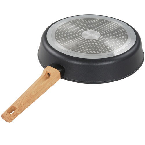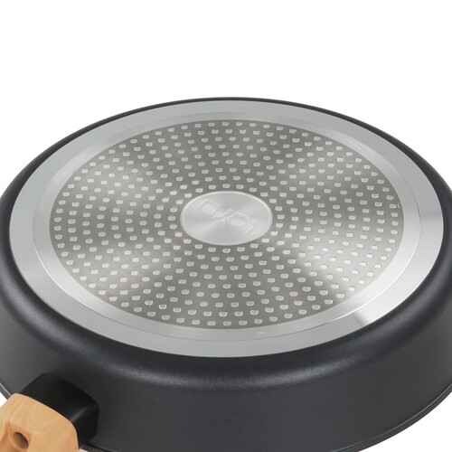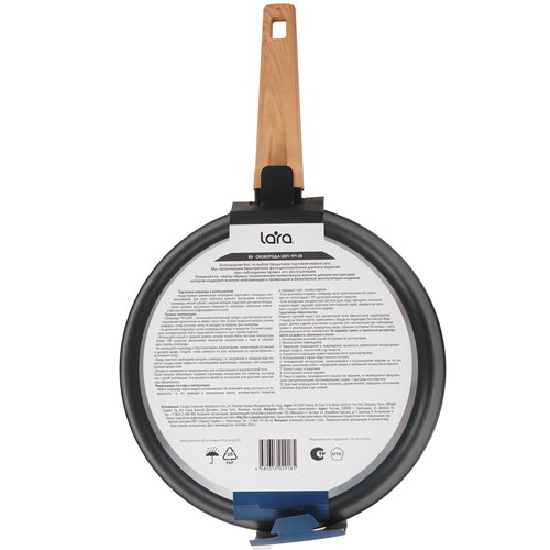 LARA Окинава LR01-191-28 диаметром 28 см использует деревянную ручку. Благодаря покрытию Soft-Touch она не выскальзывает из рук. Внутри сковороды выполнено антипригарное покрытие на водной основе. Оно устойчиво к температурным перепадам, не позволяет пище пригорать даже при минимальном количестве масла или его отсутствии.