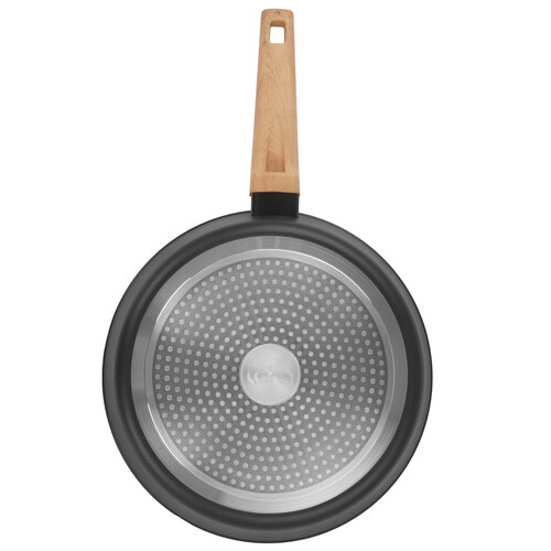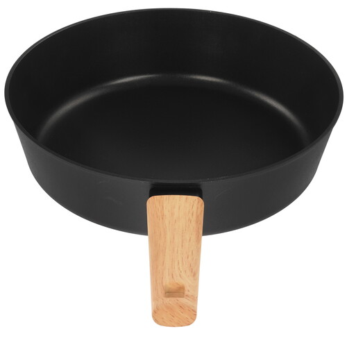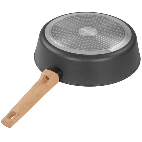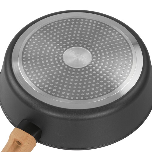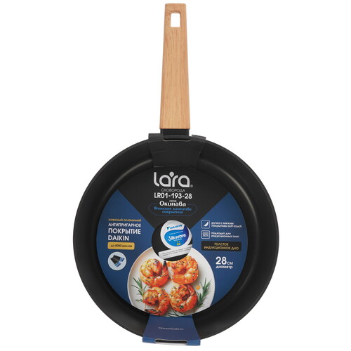 LARA Окинава LR01-193-28 диаметром 28 см использует деревянную ручку. Благодаря покрытию Soft-Touch она не выскальзывает из рук. Внутри сковороды выполнено антипригарное покрытие на водной основе. Оно устойчиво к температурным перепадам, не позволяет пище пригорать даже при минимальном количестве масла или его отсутствии.