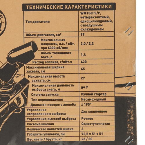 Снегоуборщик бензиновый Carver STG-3045 оснащен 4-тактным двигателем с мощностью 3 л. с. и средним расходом топлива 1.3 л/ч. Бак на 1.4 л допускает работу без дозаправки около 1 ч, чего хватает для уборки всей придомовой территории. Ковш с шириной захвата 45 см помогает быстро очищать дорожки от снега.