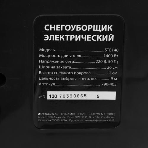 Прибор DDE STE140 дополнен удобным ковшом с шириной 26 см и высотой 12 см. Предусматривается наличие электрического двигателя на 1400 Вт, действующего от стандартной сети. С помощью такого оборудования вы легко очистите придомовую территорию от снега.