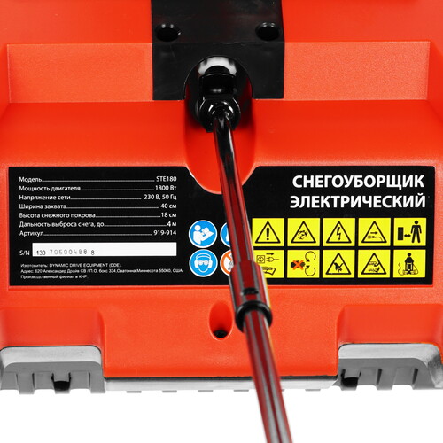 Снегоуборщик электрический DDE STE180 оптимален для использования на участках относительно небольшой площади. Модель, в частности, может быть полезна владельцам частных домов и коттеджей. С помощью снегоуборщика можно очистить от свежевыпавшего снега пространство перед крыльцом или гаражом, садовые дорожки или любые другие ровные или почти ровные поверхности с твердым покрытием. Снегоуборщик получает питание от электрической сети. Кабель агрегата имеет прочную, устойчивую к внешним воздействиям изоляцию. Мощность электродвигателя, составляющая 1800 Вт, достаточна для эффективного и комфортного решения вышеназванных задач.