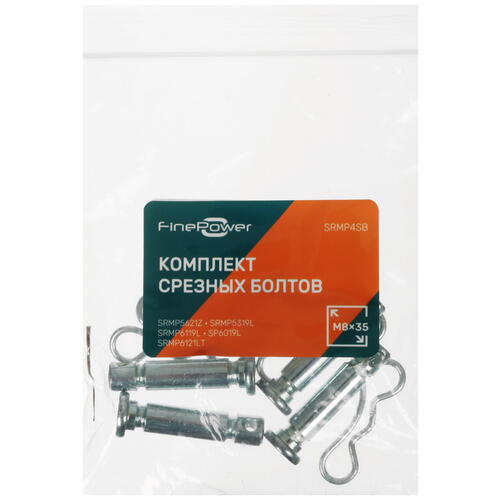 Комплект срезных болтов FinePower SRMP4SB из 4 шт подходит для 5 моделей снегоуборщиков FinePower. Штифты диаметром 8 мм длиной 35 мм обеспечивают надежное крепление шнека к валу. Срезные болты защищают ковш для сбора снега от превышения допустимой нагрузки.