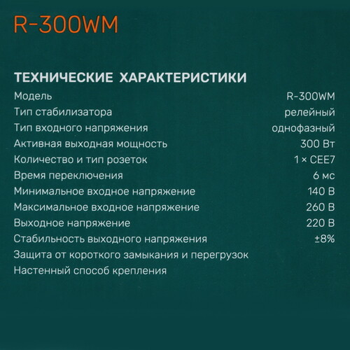 Релейный стабилизатор напряжения FinePower R-300WM рассчитан на подключение ноутбуков, осветительных приборов, бытовой техники и другого маломощного оборудования. Активная выходная мощность модели составляет 300 Вт. Нагрузка подключается к евророзетке с заземляющими контактами. Модель поддерживает функцию задержки запуска. Входное напряжение должно соответствовать диапазону от 140 до 260 В. Показатель на выходе – 220 В со стабильностью 8 %.