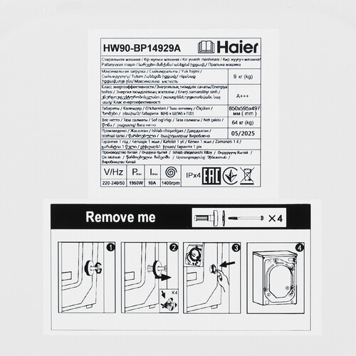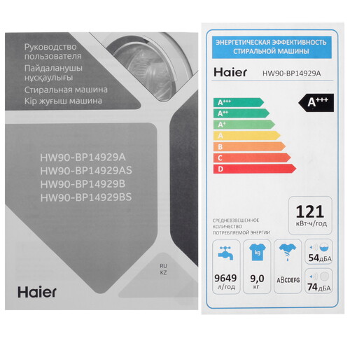 Haier HW90-BP14929A — полноразмерная стиральная машина с загрузкой до 9 кг и скоростью вращения барабана до 1400 об/мин. Внутри установлен инверторный мотор с максимальным классом энергоэффективности А+++. Гарантия на мотор — 12 лет, это говорит о его надежности.Цвет корпуса Haier HW90-BP14929A — белый, дверца и панель управления черного цвета. О вещах позаботятся 15 интеллектуальных программ стирки, включая режим для деликатных вещей, усиленную гигиену при 90 ℃ и самоочистку.Стиральная машина оборудована важнейшими технологиями Haier. Обработка паром освежит одежду (даже ту, которой стирка в воде противопоказана). Если активировать пар во время обычной стирки, порошок глубже проникнет в ткань. Антибактериальная обработка манжеты люка и лотка для чистящих средств, а также технология Smart Dual Spray защитят ваши вещи и технику от плесени и бактерий. Барабан с подушечками Pillow будет максимально бережно работать с любыми тканями.