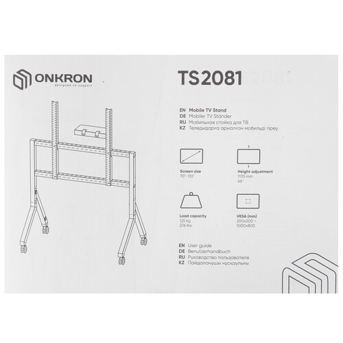 ONKRON TS2081-B – воплощение мощи и грации в мире мобильных стоек для телевизоров. Эта стойка, созданная для самых больших и впечатляющих экранов диагональю от 70 до 110 дюймов и весом до 120.5 кг, превращает любое пространство в домашний кинотеатр или переговорную комнату премиум-класса.