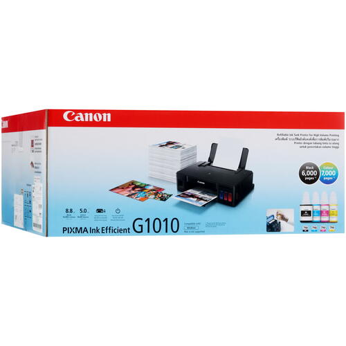 Принтер струйный Canon PIXMA G1010 – настольная модель с цветной технологией печати и системой непрерывной подачи чернил, которая может использоваться для распечатки документов и фотографий в формате до А4. Устройство облачено в черный корпус с размерами 445x135x330 мм и весом 4.8 кг. Поддерживается совместимость принтера Canon PIXMA G1010 с компьютерами, которые функционируют на базе операционной системы Windows 7, Windows 8.1 или Windows 10. Устройство можно использовать для печати на обычной бумаге, наклейках, конвертах, глянцевой или матовой фотобумаге плотностью от 64 г/м² до 105 г/м².