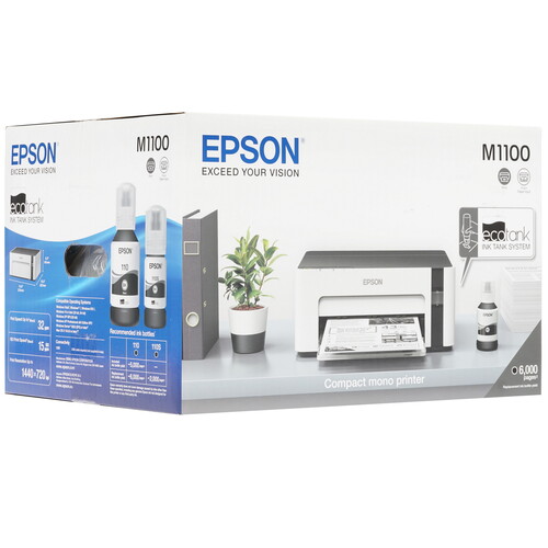 Принтер струйный Epson M1100 – элегантная модель, подходящая для небольшого офиса. В ней используется технология пьезоэлектрической печати Epson Micro Piezo и печатающий механизм, к которому подсоединяется емкость с чернилами, а не картридж. Они обеспечивают высокое качество документов и скорость при низком энергопотреблении.