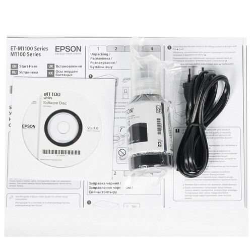 Максимальный формат бумаги, подходящей для Epson M1100, – это А4. Принтер совместим с компьютерами, работающими на Windows и MacOS. Благодаря компактному размеру для него легко найти место на рабочем столе. Модель идеально подходит для специалистов, непосредственно обслуживающих клиентов с выдачей им подготовленных на месте документов: менеджеров по продажам финасовых и страховых услуг, товаров, изготавливающихся под заказ или требующих доставки. В комплекте есть флакон чернил объемом 120 мл, чего достаточно для печати 5000 страниц.