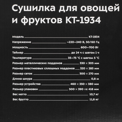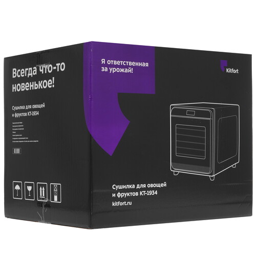 Сушилка для овощей и фруктов Kitfort KT-1934 подходит для сушки овощей, фруктов, ягод, грибов, трав, зелени, корнеплодов, а также хлеба, мяса, рыбы. Мощный нагревательный элемент и вентилятор увеличенного диаметра равномерно распределяют тепло по всему внутреннему пространству. Технология горизонтального обдува помогает уменьшить смешивание запахов. Панель управления позволяет установить температуру и время до 24 часов с шагом 60 минут. В комплекте с Kitfort KT-1934 поставляются 8 металлических сетчатых поддонов, 8 пластиковых сетчатых поддонов и 8 пластиковых сплошных поддонов. Металлический корпус защищает прибор от повреждений, а прозрачное окно на дверце позволяет наблюдать за процессом сушки продуктов.