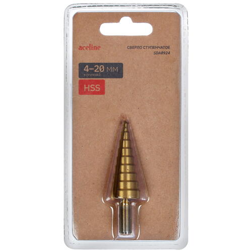 Сверло ступенчатое Aceline SDA0924 диаметр отверстия 4-20 мм, и имеет 9 ступеней.
