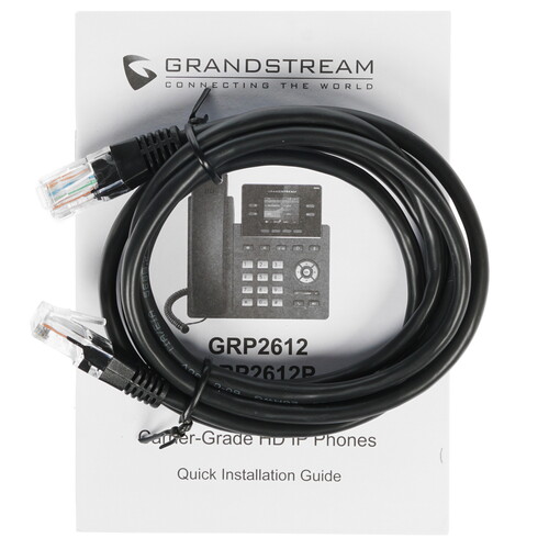 Телефон VoIP Grandstream GRP2612P может размещаться как на столе, так и на стене (настенное крепление приобретается дополнительно). В комплекте – документация, подставка и кабель Ethernet. Цвет корпуса – черный. Телефон имеет габаритные размеры 209x193x52.1 мм и массу 554 г.