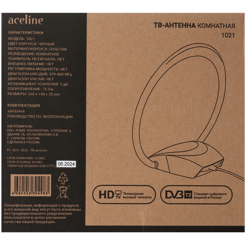 ТВ антенна Aceline 1021 предназначена для приема сигнала в диапазоне от 470 до 860 МГц. Это антенна с коэффициентом усиления 5 дБ, которая работает в диапазоне UHF. Антенна является пассивной, что означает, что она не требует дополнительного питания. Предназначена для установки в помещении и имеет стильный черный дизайн, который подойдет к любому интерьеру.