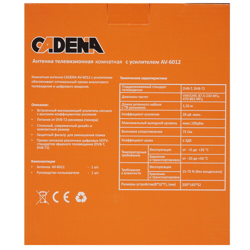 ТВ-Антенна CADENA AV-6012 рассчитана на установку внутри помещений. Это компактное устройство: его размеры составляют 200x165x52 мм. Антенна займет немного места на столе, тумбе или подоконнике. Модель подключается к телевизору кабелем, длина которого равна 1.33 м. Черный цвет корпуса антенны гармонично сочетается с дизайном большинства телевизионных приемников.