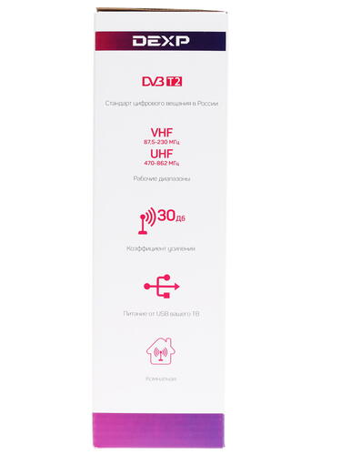 Антенна поддерживает DVB-T2. Коэффициент усиления у данной модели оптимальный, составляет 30 дБ. Устройство предназначено исключительно для размещения в комнате, не допускается установка вне помещения.