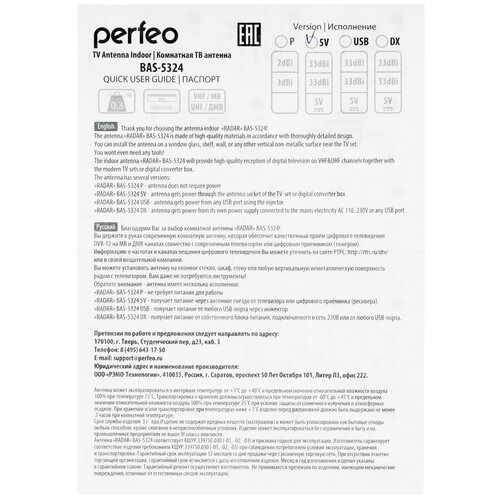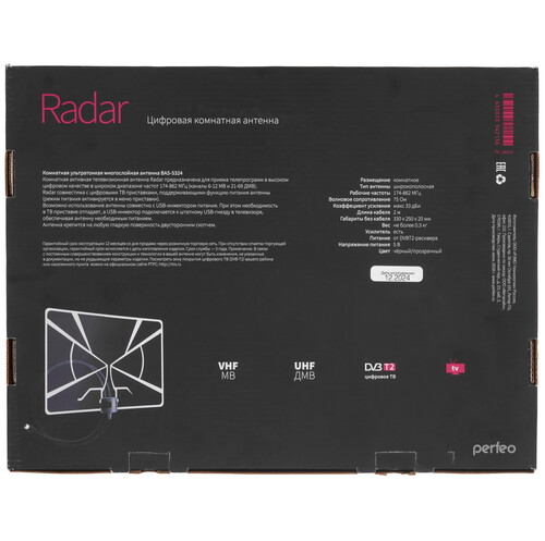 Белая активная ТВ-Антенна Perfeo RADAR предназначена для размещения в помещении. Это устройство обеспечивает прием сигналов UHF (ДМВ), VHF (МВ), DVB-T2. Также оно позволяет усиливать их и получать более четкое изображение. Комнатная антенна Perfeo RADAR гарантирует качество изображения и позволяет наслаждаться любимыми телепрограммами без помех и сбоев. Питание устройство получает внешнее.