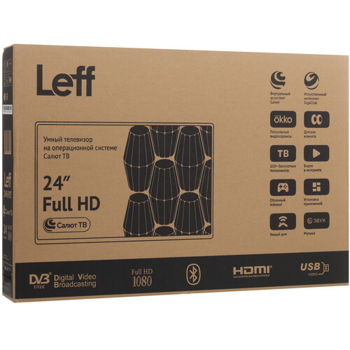 LED-телевизор Leff 24F690T оснащен оптимальным для 24-дюймового экрана Full HD разрешением. Угол обзора 178° сохраняет четкость картинки и реалистичность передачи цвета при просмотре ТВ из любой точки комнаты. Динамики на 6 Вт дополнены системой улучшения звука Dolby Digital. ОС Салют ТВ открывает доступ к приложениям Smart TV, расширенным настройкам и функциям. 1 ГБ ОЗУ хватает для работы ТВ без зависаний, а 8 ГБ встроенной памяти – для установки приложений для всей семьи. На пульте ДУ есть кнопка для активации ассистента Салют и управления телевизором голосом.