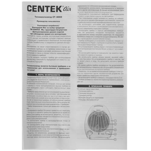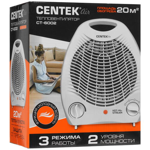 Маленький и легкий тепловентилятор Centek CT-6002 обеспечит комфортный микроклимат в любом помещении площадью до 20 кв. м. Это соответствует квадратуре просторной комнаты или офисного помещения. Прибор имеет встроенный вентилятор и 3 режима работы. Мощностью нагрева можно управлять на 2 уровнях с использованием термостата и механического переключателя. При необходимости прибор получится применять как вентилятор, чтобы в помещении стало прохладнее. За счет небольшого корпуса он занимает минимум места. Для переноски тепловентилятора Centek CT-6002 в его верхней части предусмотрена встроенная ручка.