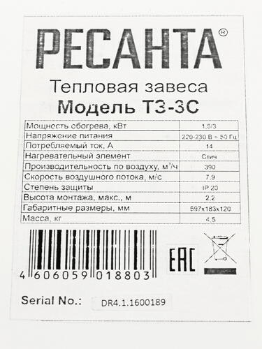 Уровень мощности Ресанта ТЗ-3С можно регулировать от 1500 Вт до 3000 Вт. На корпусе располагаются элементы управления работой тепловой завесы. Представленная модель монтируется горизонтально на высоте 2.2 метра. Габариты корпуса устройства составляют 59.7х18.3х12 см.