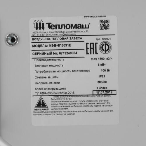 Пульт ДУ позволяет легко управлять доступными параметрами и функциями. Прибор выполнен в прочном стальном корпусе и поддерживает монтаж в вертикальном/горизонтальном положении. Защищенная конструкция с классом IP21 обеспечивает надежность в эксплуатации тепловой завесы Тепломаш КЭВ-6П3031Е.
