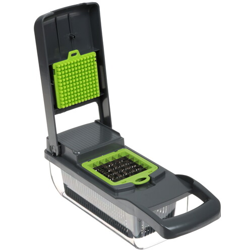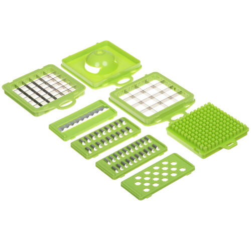 Овощерезка Aceline A14MG с дизайном в сером и зеленом цветах производит крупное и среднее измельчение. Модель поставляется с 7 насадками и поддерживает 5 видов нарезки – бруски, кубики, ломтики, пюре и терка. Материал ножей – нержавеющая сталь.