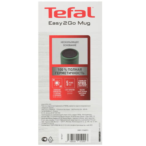 Термокружка Tefal Easy2Go N2110417 способна длительное время поддерживать температуру горячих или холодных напитков. Высокие изоляционные свойства достигаются благодаря вакуумной колбе, которая изготовлена из нержавеющей стали. Внешняя сторона кружки изготовлена из термостойкого и долговечного полипропилена. В собранном виде кружка отличается полной герметичностью. При необходимости очистки кружка из двух частей легко разбирается. Эргономичная форма корпуса и откидная крышка повышают удобство в эксплуатации Tefal Easy2Go N2110417.