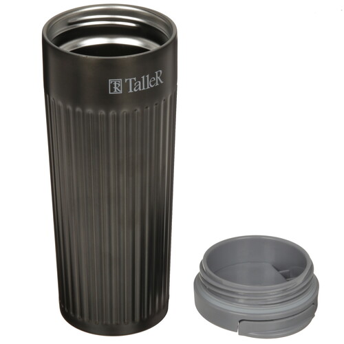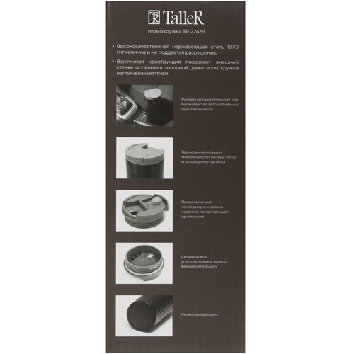 Корпус и внутренняя колба темрокружки изготовлены из пищевой нержавеющей стали 304 (18/8), устойчивой к коррозии и не влияющей на вкус напитка. Крышка с клапаном позволяет удобно пить, не открывая полностью. За счет компактного формата TalleR TR-22439 легко помещается в подстаканник автомобиля или держатель рюкзака.