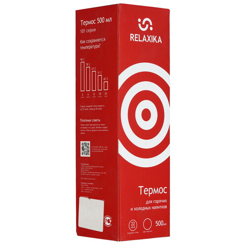 Классический термос Relaxika с высокими показателями удержания температуры напитка для походов, путешествий, спорта и ежедневного использования. Прочные двойные стенки из высококачественной нержавеющей стали 18/8 с вакуумной изоляцией гарантируют, что ваш напиток останется холодным в течение 28 часов и горячим до 22 часов. Этот материал не только прочен, но и гигиеничен, не выделяет никаких вредных для здоровья веществ. Ваши напитки сохраняет естественный вкус и не приобретут посторонний запах.