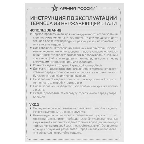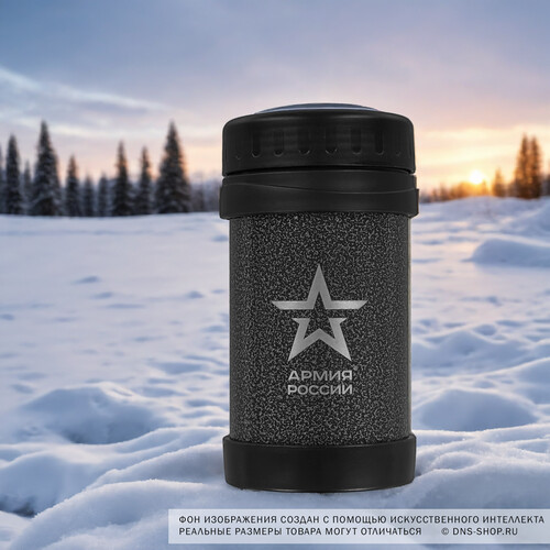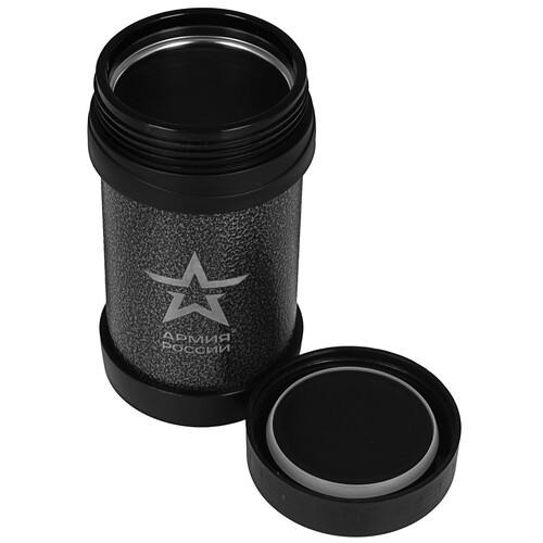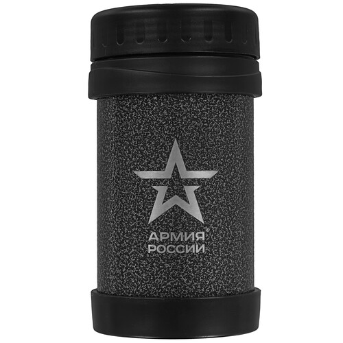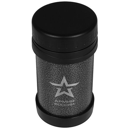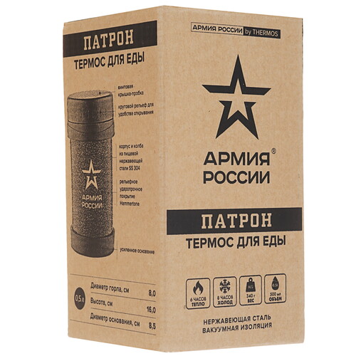 Термос Thermos Армия России "Патрон" 645203 серого цвета с вакуумной термоизоляцией и герметичной крышкой-пробкой позволяет хранить готовое блюдо горячим в течение 6 часов, или холодным – не менее 8 часов. Благодаря широкому горлышку термос подходит для переноски первых и вторых блюд.