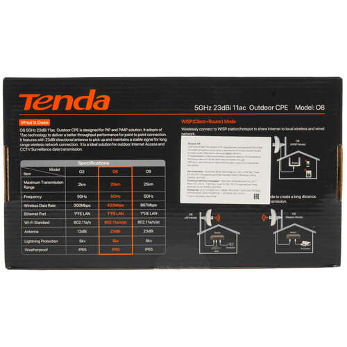 Беспроводная точка доступа Tenda O8 осуществляет передачу данных по частоте 5 ГГц и позволяет получить скорость интернет-соединения до 433 МБит/сек. Для обеспечения безопасности соединения сетевое устройство получает поддержку протоколов WEP, WPA, WPA-PSK и WPA2-PSK. Для управления работой точки доступа можно использовать CPE Assistant или Web-интерфейс. Модель получает питание через PoE по Ethernet-кабелю, поэтому вместе с ней поставляются PoE-инжектор и адаптер питания.