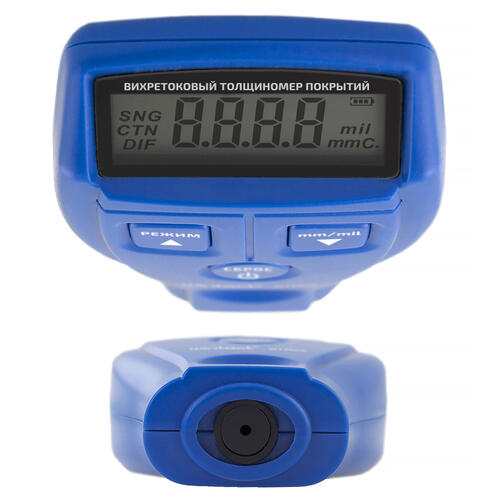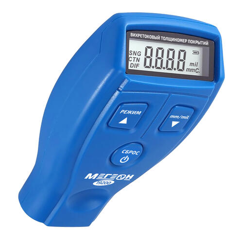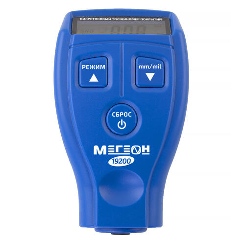Получивший компактный оранжевый корпус толщиномер Мегеон 19200 обладает временем отклика всего 0.15 сек. Диапазон измерения толщины покрытия у этой модели находится в пределах 0-1800 мкм. Снабженный подсветкой экрана прибор укомплектован двумя батарейками типа ААА, используемыми в качестве элементов питания, и калибровочными пленками.