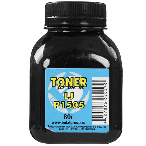 Тонер Булат AAHPLJ1505021 черного цвета предназначен для картриджей. Он упакован в пластиковую банку размером 60x60x90 мм и емкостью 80 г. Булат AAHPLJ1505021 совместим с принтерами бренда HP.