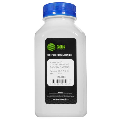 Тонер Cactus CS-THP10-55 поставляется во флаконе емкостью 55 г, которого хватит на несколько заправок. Плотно закручивающаяся крышка обеспечивает герметичность емкости, защищая тонер от влаги и других негативных воздействий, а также позволяя надежно хранить его на протяжении длительного времени. Для удобной и быстрой заправки картриджей необходимо использовать воронку или другие приспособления.