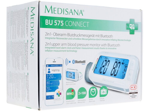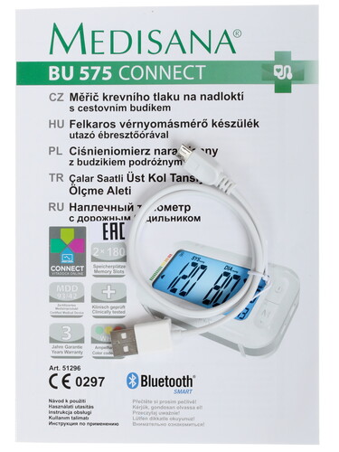 Тонометр Medisana BU 575 Connect способен запоминать полученные данные и высчитывать их среднее значение. Предусмотрена возможность подключения прибора к ПК и передачи результатов с помощью Bluetooth. Сообщения об ошибках пользователя позволяют проводить измерения правильно. В комплекте прилагается кабель mini-USB и сумка для хранения устройства.