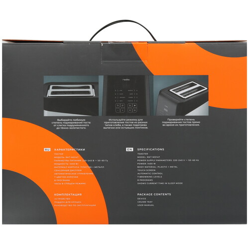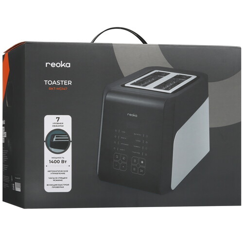 Reoka RKT-MD147 с двумя стандартными слотами оснащен системой автоцентрирования для равномерной прожарки тостов с обеих сторон. Модель показывает обратный отсчет времени и издает звуковой сигнал по окончании работы. Встроенная система защиты отключает устройство при риске перегрева.