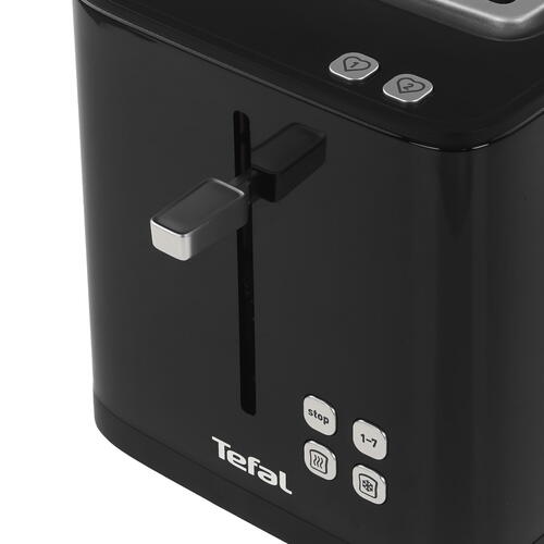 Tefal TT640810 с электронным управлением оснащен семью степенями обжарки и набором дополнительных функций. Вы можете размораживать хлеб, подогревать приготовленные ранее тосты, нажимать кнопку отмены при подгорании из-за сильной мощности. Дисплей показывает выбранные режимы и время до конца программы. Функция памяти позволяет сохранять до двух любимых настроек приготовления тостов.