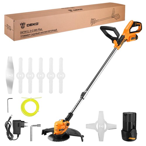 Триммер садовый аккумуляторный DEKO DKTR12, 2*2.0Ач Plus - компактная модель, удобная для скашивания травы в труднодоступных местах, вдоль заборов, клумб, подравнивания газонов, краев садовых дорожек.