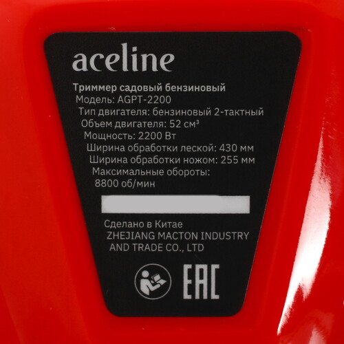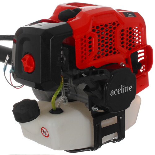 Триммер бензиновый Aceline AGPT-2200 приводится в действие двухтактным двигателем с рабочим объемом 52 см³, мощностью 3 л. с. и частотой вращения до 8800 об/мин. Мотор использует в качестве топлива смесь бензина АИ-92 и масла. Объем бака составляет 0.9 л. Запуск двигателя после длительного простоя упрощается благодаря наличию праймера. Дополнительное преимущество агрегата – наличие функции легкого старта. Безопасность работы гарантирует защитный кожух. Верхнее расположение двигателя упрощает управление триммером.