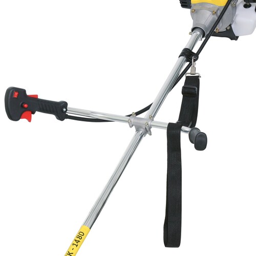 Бензотриммер мощностью 1480Вт с разборной штангой, что делает его компактным при перевозке и хранении. Для кошения можно использовать как леску, так и нож.