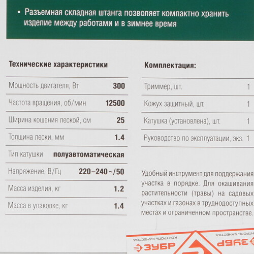 300 Вт, 12500 об/мин, леска 250 мм, ∅1.4 мм, 1.1 кг