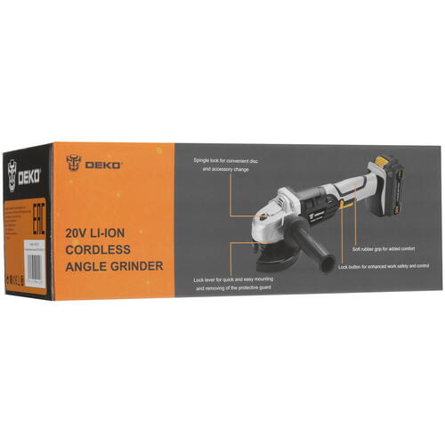 В основе DEKO DKAG20-125 063-2150 используется щеточный двигатель. Его мощность может обеспечить скорость вращения насадки до 8500 об/мин. Максимальный диаметр диска может достигать 125 мм. Установка отличается своей простотой, производится за счет крепления размером 22.2 мм. Для защиты оператора в конструкции также предусмотрен специальный кожух, который легко и быстро может быть установлен на инструмент.