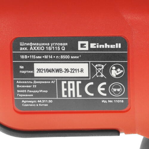 Оборудование Einhell PXC AXXIO 18/115 Q способно развивать скорость до 8500 об/мин. Имеется защита от перегрузок, простая безинструментальная установка оснастки и система плавного пуска. Для данной модели потребуется АКБ Li-Ion с креплением-слайдером 18 В и подходящее ЗУ. Инструмент поставляется в коробке с боковой рукояткой и быстрозажимной гайкой.