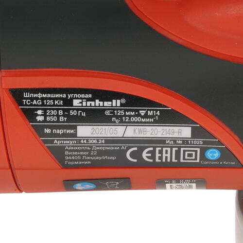 В основе Einhell TC-AG 125 kit используется щеточный двигатель. Благодаря его мощности в 850 Вт скорость вращения насадки может достигать 12000 об/мин, что позволит легко выполнять любые типы работ. Для их выполнения в данной модели используется диск размером 125 мм, который устанавливается при помощи классического крепления размером 22.2 мм.