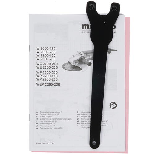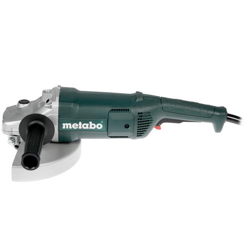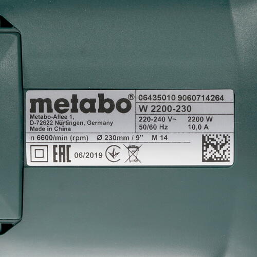 Metabo W 2200-230 оснащена ручкой, которая может закрепляться в трех позициях по выбору пользователя в зависимости от удобства эксплуатации изделия. Питание устройства осуществляется от сети с помощью сетевого кабеля, предусмотрена защита от перегрузок. Дополнительными функциями является фиксация шпинделя и блокировка вала, что позволяет производить замену рабочих элементов без отключения прибора. В комплект входит рукоятка и ключ для смены диска.