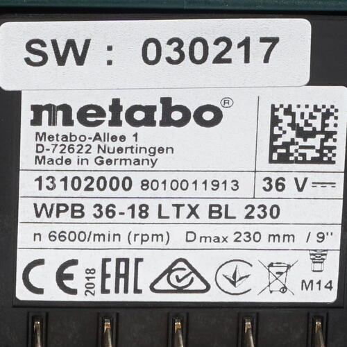 Углошлифовальная машина (УШМ) Metabo WPB 36-18 LTX BL 230 18 В , Без ЗУ, Без АКБ [1150778]